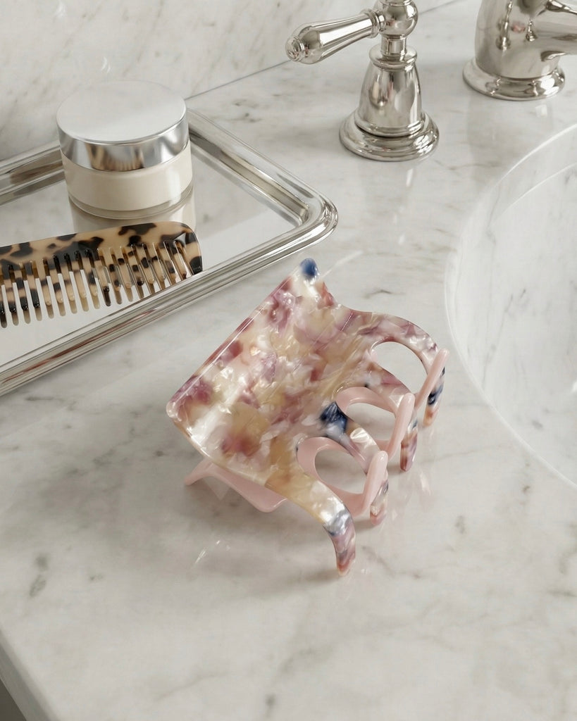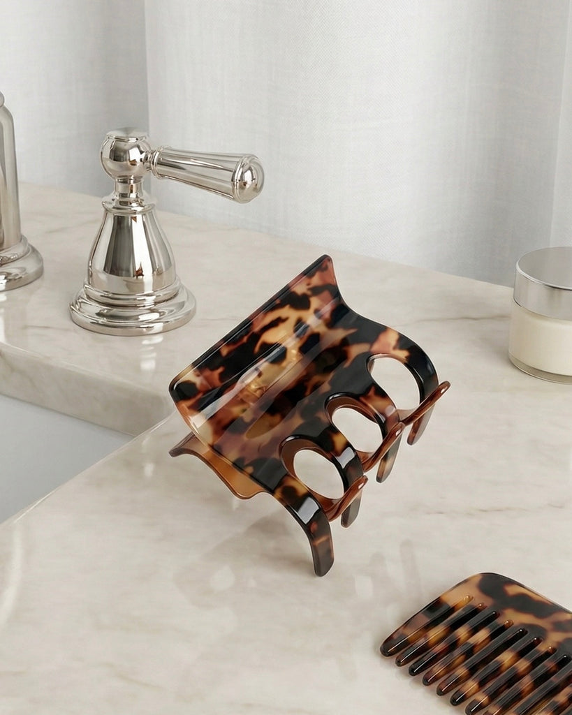 Our Elara Acetate Claw features a width of 7.3cm and height of 4.5cm. Elara is the ideal size to hold your hair securely while adding a fashionable flair.